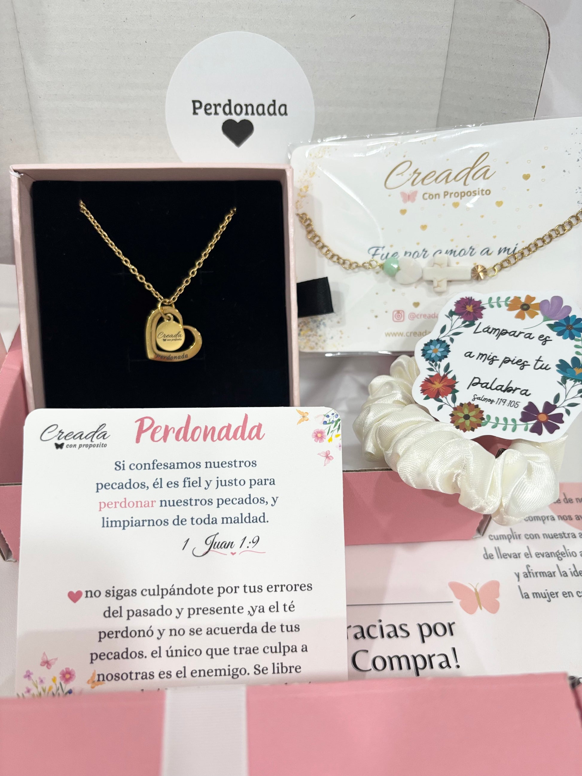 La cajita “perdonada” contiene una cadena y una pulsera, y unos regalitos de parte de creada con propósito.